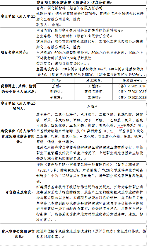 朗亿新材料(烟台)有限责任公司新型电子专用材料及配套功能性材料项目、大唐(寿光)新能源有限公司大唐寿光羊口东、营里500MW基地光伏发电项目职业病危害预评价信息公开表